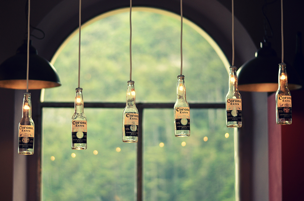 People celebrating the new year by using empty bottles as light bulbs